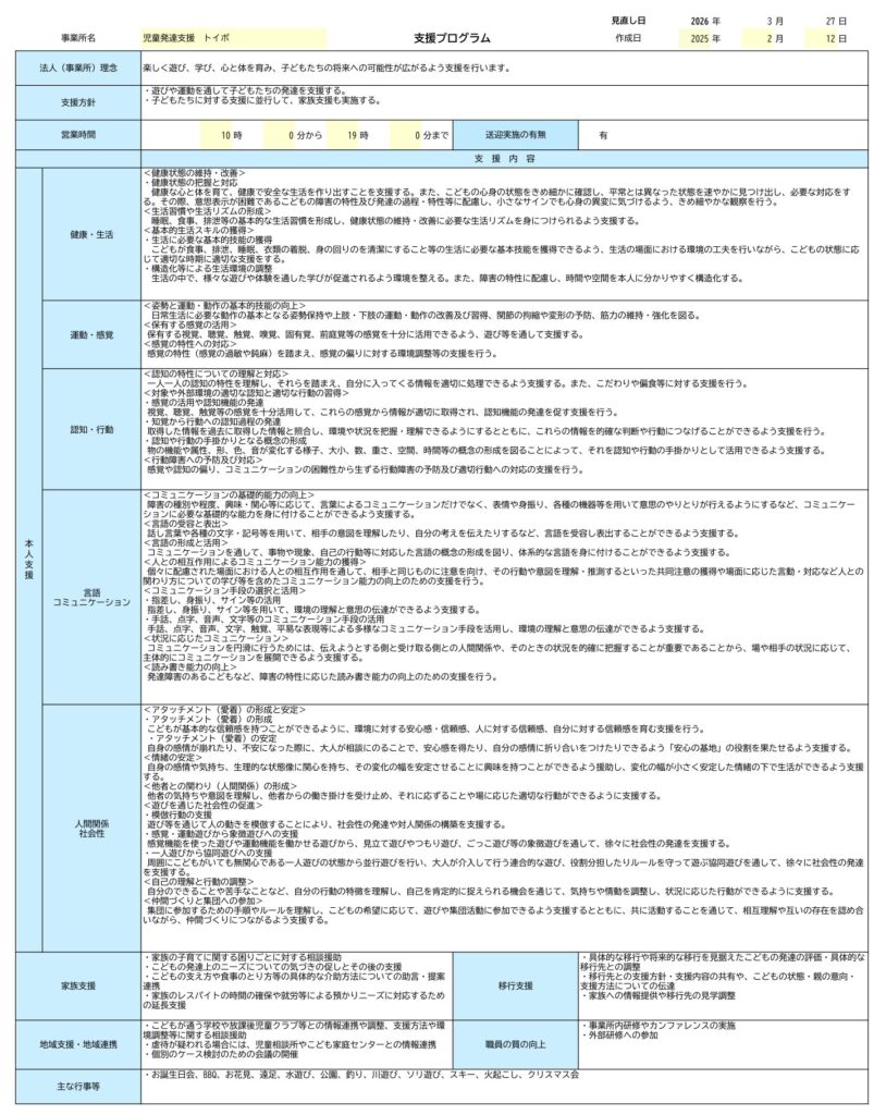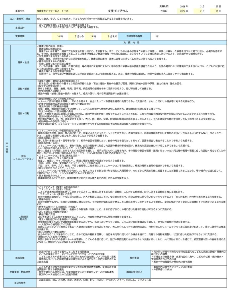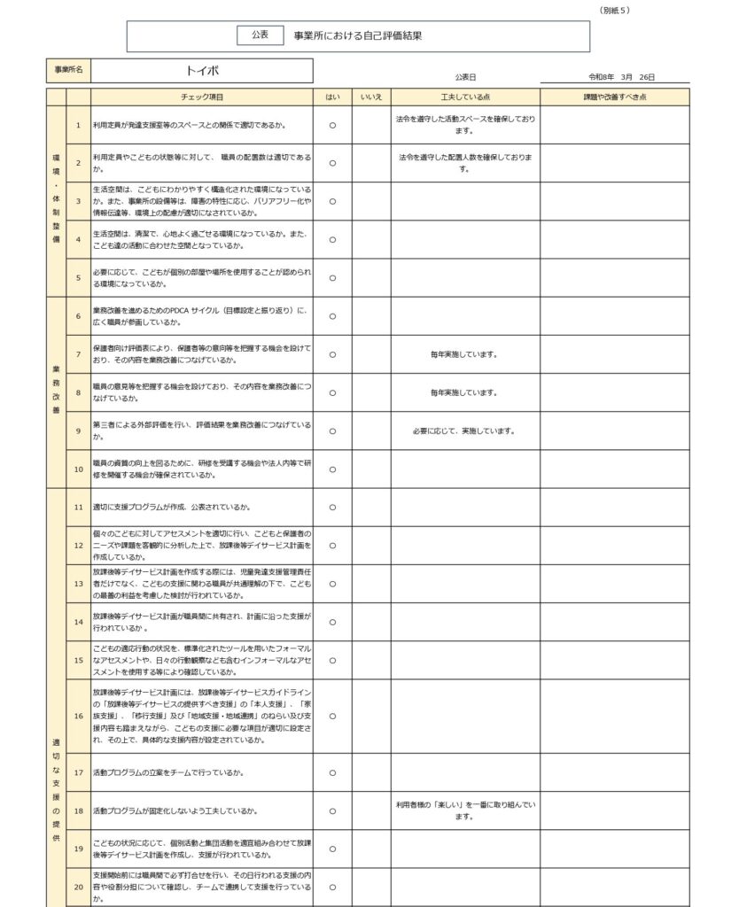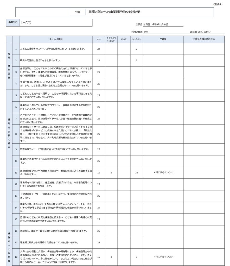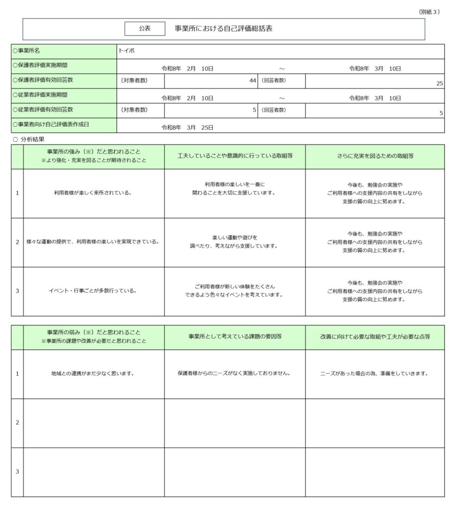 公表用 2026.02.272026.04.10 目次 トイボ 児童発達支援 支援プログラムトイボ 放課後等デイサービス 支援プログラム事業所における自己評価総括表事業所における自己評価結果保護者評価シート トイボ 児童発達支援 支援プログラム トイボ 放課後等デイサービス 支援プログラム 事業所における自己評価総括表 事業所における自己評価結果 保護者評価シート